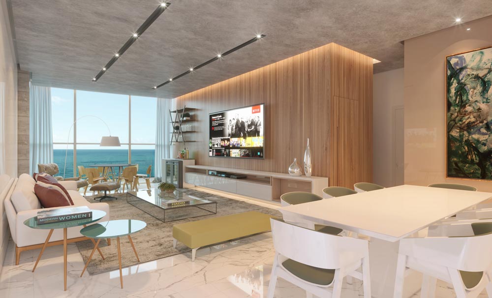 O edifício oferece duas modalidades de apartamentos: Destino, com três suítes, uma suíte master à beira-mar com closet e banheira, três vagas de garagem, sala integrada com varanda e vista para o mar; e Panorâmico, com quatro suítes, uma suíte master à beira-mar com dois closets e dois banheiros, 33m² de varanda com apoio gourmet, deck e hidromassagem, quatro vagas de garagem, sala integrada com varanda e vista para o mar.