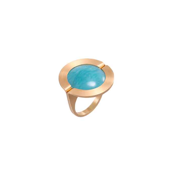 A chapa de ouro se abre na lateral do anel, formando o aro de contorno circular. No seu interior, repousa pedra, como se calmamente estivesse prestes a extravasar.