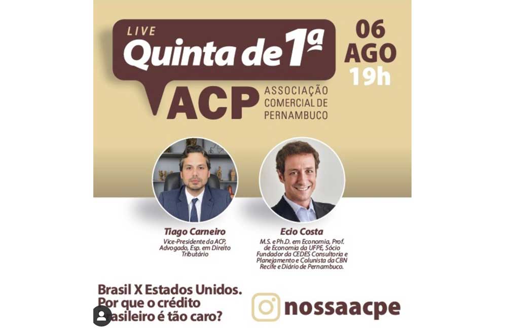Na próxima quinta-feira (06) será realizada mais uma edição da série “Quinta de 1ª” no Instagram da Associação comercial de Pernambuco (@nossaacpe). Esta primeira transmissão do mês de agosto contará com a temática “Brasil X Estados Unidos. Por quê o crédito brasileiro é tão caro?”, comandado por Tiago Carneiro, vice-presidente da ACP, ao lado do convidado da vez. O participante será o consultor econômico Ecio Costa, professor de economia da Universidade Federal de Pernambuco (UFPE) e colunista da CBN Recife e do Diario de Pernambuco.