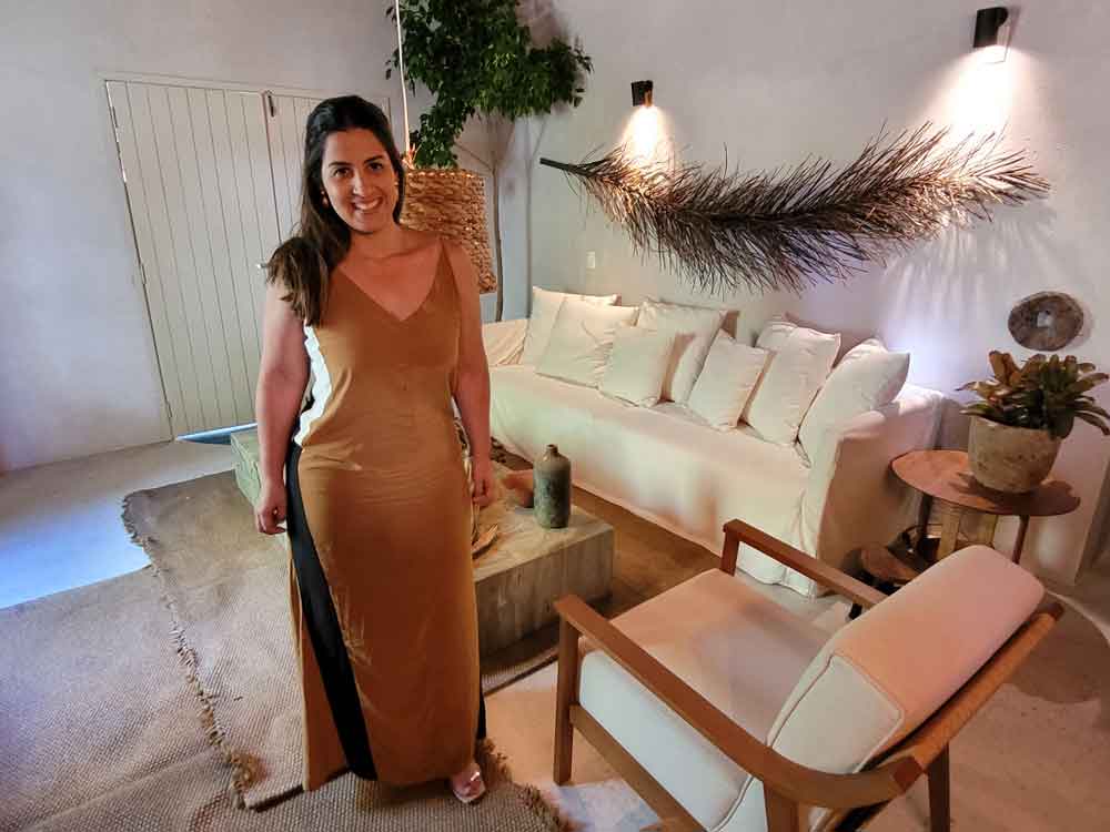Rafaella Bittencourt aposta no reuso, no reciclar e no resignificar com uma pegada que remete às choupanas rústicas com conforto. A decoração mescla o mobiliário contemporâneo com peças handmade, como mesas de cabeceira com interferência de cordas e tachos de barro ganham uma releitura e se transformam em cubas para os banheiros, por exemplo. “Muito da ambientação é com elementos artesanais, o luxo com o pé na areia, o simples com acolhimento”, explica a arquiteta. No living, ambiente sonorizado, um bar e um paisagismo especial com uma árvore dentro da sala vão proporcionar encontros despojados dentro do bangalô, que ganha telas do artista plástico Jeferson Cunácia.