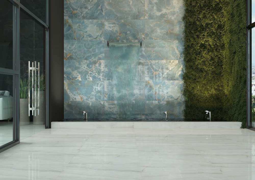 O ônix é uma das pedras mais raras da natureza. Na coleção Maestro, o material é reproduzido, nas medidas 58×118,2 cm, num tom de azul complexo e profundo exaltando a tendência das pedras exóticas e raras na arquitetura de interiores.