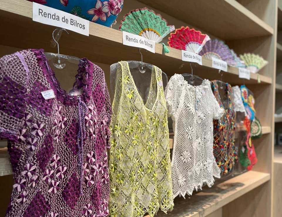 Os itens estão à venda na loja Patteo Social, no piso L1 do shopping, e incluem uma ampla variedade de artigos feitos à mão, como bolsas, sandálias com aplicações, colares, roupas e peças de decoração. As técnicas utilizadas vão do crochê e tricô a trabalhos em renda de bilros — um artesanato tradicional e centenário, reconhecido pelos delicados padrões formados pelo entrelaçamento de fios sobre uma almofada, com o auxílio de pequenos bastões chamados bilros.