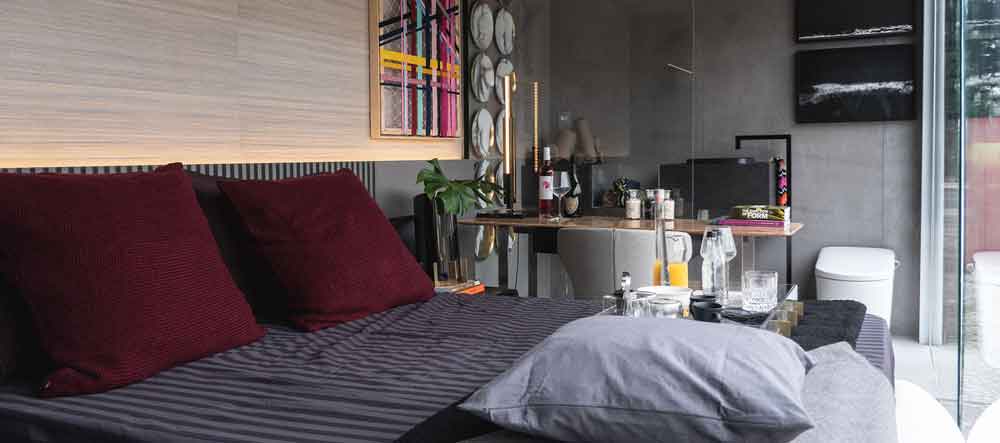 O nome do ambiente de Arthur Guimarães – Suíte Eigen – vem da palavra alemã Eigenlicht, que significa luz intrínseca e se refere à interferência visual que enxergamos quando mantemos nossos olhos fechados. A intensidade do cinza pode variar levemente para cada pessoa, adaptando-se a cada contexto. E é essa cor que predomina o espaço, criando uma monocromia quebrada somente por obras de arte e objetos decorativos em locais pontuais. No mobiliário, móveis de design italiano, como a icônica cadeira Papilio de Naoto Fukasawa, se mesclam com peças desenhadas pelo próprio arquiteto.