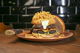 E como se não bastasse, o final épico: uma coroa de 200g de batata frita coberta com cheddar e bacon no topo do hambúrguer.
