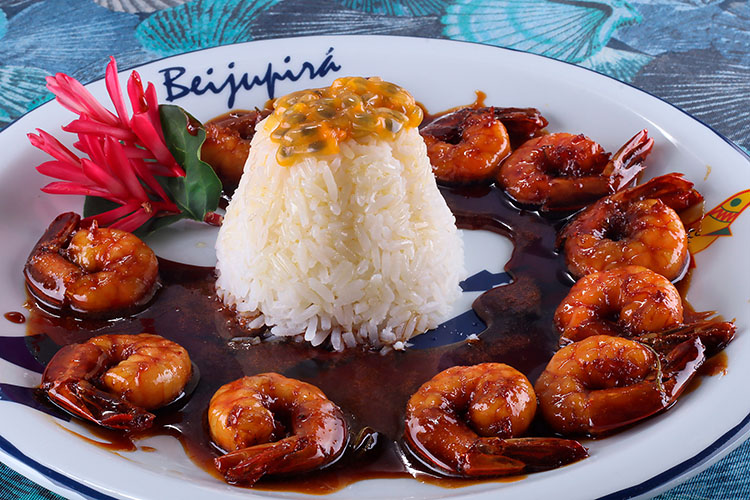 Camarões envolvidos num delicioso mel de engenho com alecrim e arroz de maracujá.