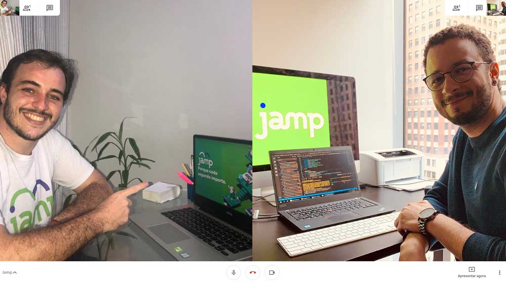 Os sócios Alexandre Dornellas e Thiago Ribeiro, à frente da Jamp, mantendo o esquema de isolamento social em meio à pandemia de coronavírus (Crédito: Divulgação)