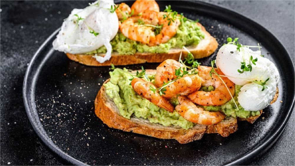 Em cada tosta de baguete adicione o creme de abacate e os camarões.