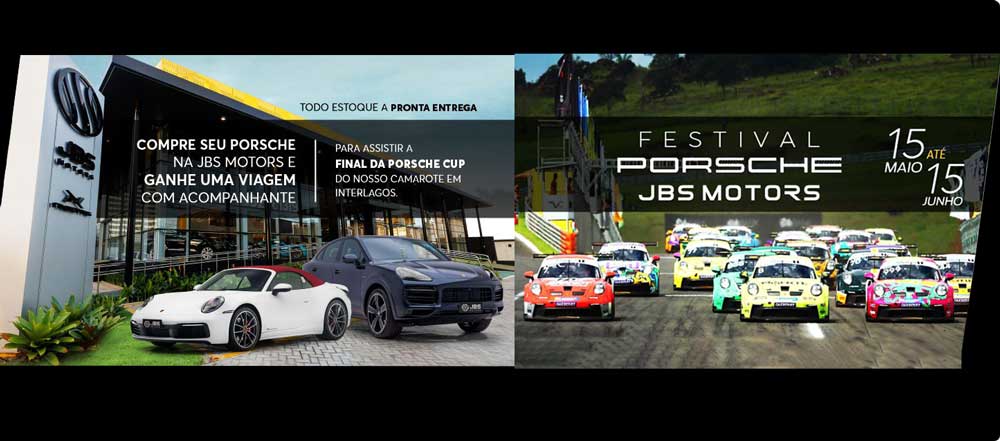 O “Festival de Porsches” se configura como uma experiência sem precedentes para os admiradores da marca. Aqueles que adquirirem um veículo Porsche na JBS Motors entre 15 de maio e 15 de junho de 2023, ganharão, junto a um acompanhante, a chance de assistir a grande final da Porsche Cup Brasil em novembro.