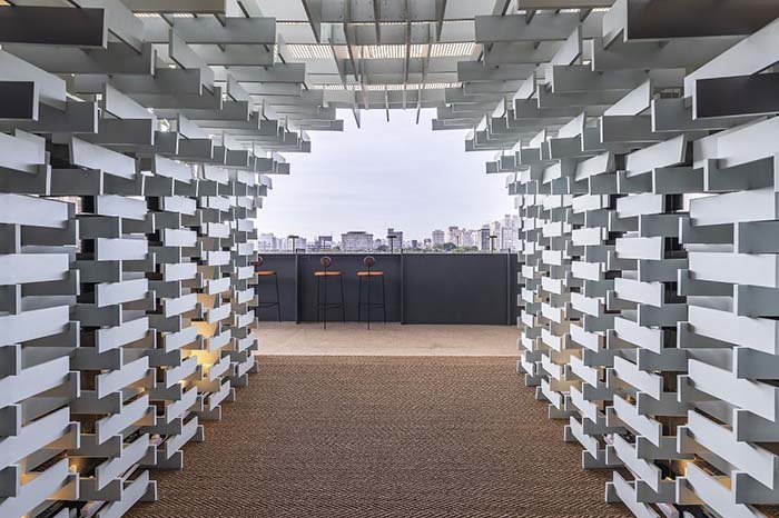 O muxarabi e a treliça também estão presentes no Espaço Ser assinado pelos profissionais Alex Bonilha e Mahely Oliveira. Logo na entrada do ambiente, a treliça feita com painel Preto, da linha Trama, ladeia a lateral esquerda e o teto do espaço setorizando um grande hall.