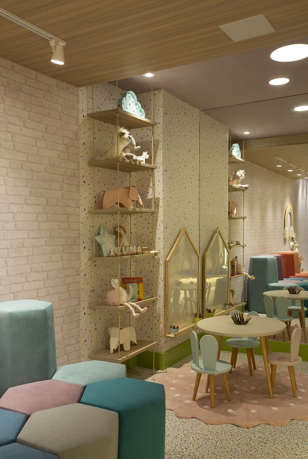 Na parte de decoração, o papel de parede, também da Livre Decor, remete a pingos de tinta, representando a criatividade da criança e, na saída, parede assinada pelo ilustrador Helton Rodrigues de França, com objetos e temas que Helena e Dudu, as personas do espaço, se identificam. Nas estantes, brinquedos tradicionais, de madeira e pano e livros, reforçando a ideia de desenvolvimento lúdico da criança.