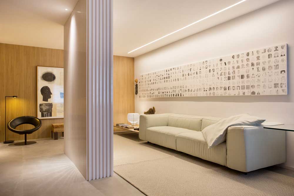 A iluminação, toda em led, foi pensada para dar destaque às obras expostas. Temos iluminação pontual que banha a estante bem como telas e esculturas presentes na cena. Uma luminária linear acompanha e ilumina a obra de Renato Valle de 4,80m além de abajures que compõem os cantinhos da sala.