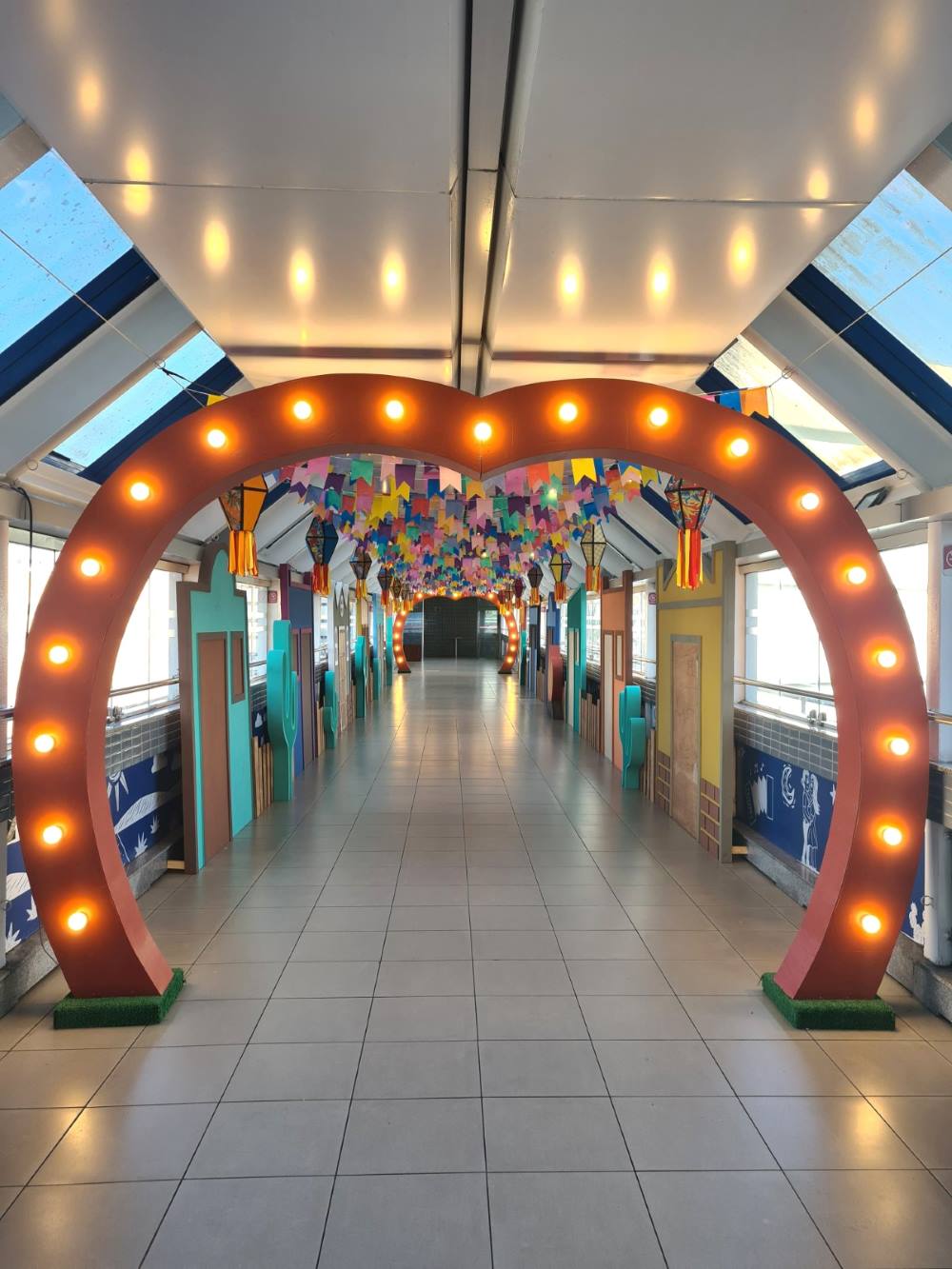 Além de cidade cenográfica, a Praça de Eventos do Shopping Boa Vista recebe ainda uma feirinha típica que está comercializando itens como acessórios, vestuário e alimentação, entre outros. Por falar em decoração, a passarela do centro de compras também se vestiu com a temática junina, com bandeirinhas e balões, além de dois corações iluminados.