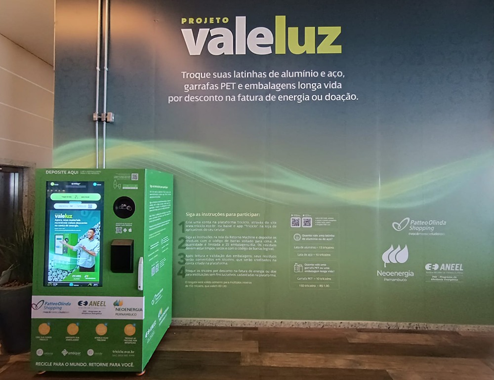 Os moradores de Olinda agora podem trocar resíduos sólidos por descontos na fatura de energia elétrica com maior facilidade. Em prol da ampliação das possibilidades para a sustentabilidade, a Neoenergia Pernambuco concluiu a instalação da máquina automática de reciclagem, conhecida como Retorna Machine, no Shopping Patteo Olinda. De origem do Projeto Vale Luz, que faz parte do programa de Eficiência Energética da distribuidora, regulado pela Aneel (Agência Nacional de Energia Elétrica), o equipamento está localizado no piso L3 do centro de compras.
