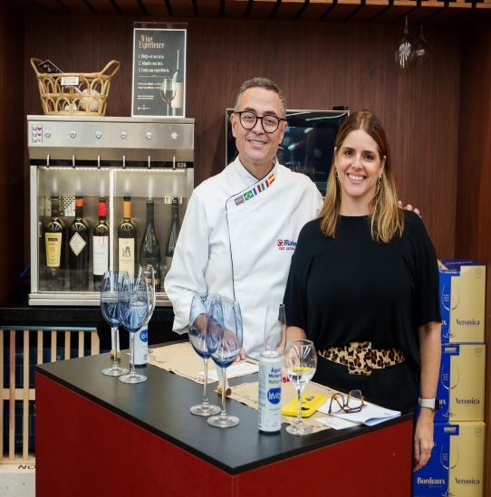 O chef do Grupo Mateus, Luciano Rosas, e a sommelière Amanda Loyo durante evento de harmonização de finger foods com vinhos da Wine Concept Brasil, realizado na nova loja do Mateus, em Casa Forte.