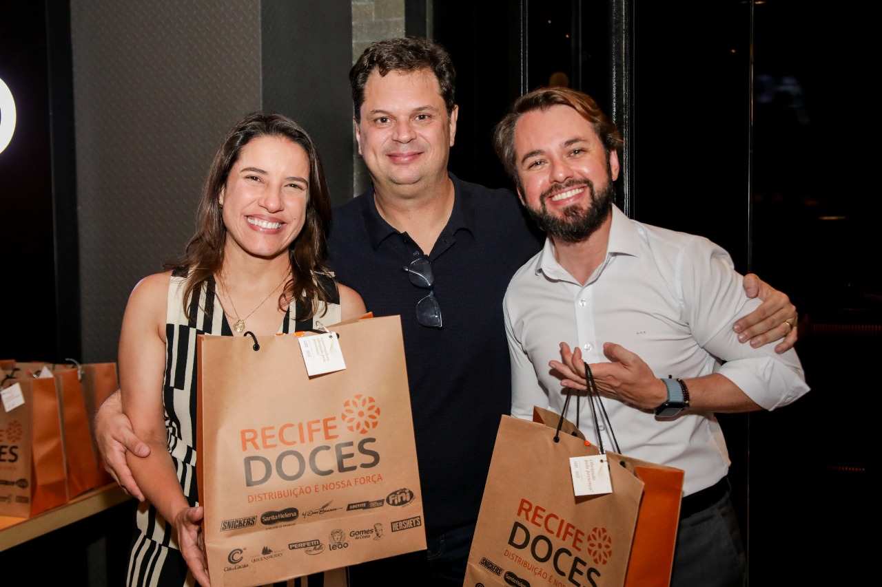 Drayton Nejaim, presidente do Sistema LIDE Pernambuco (centro), recebendo a governadora Raquel Lyra e o presidente da Adepe, André Teixeira, durante encontro empresarial realizado pelo LIDE.