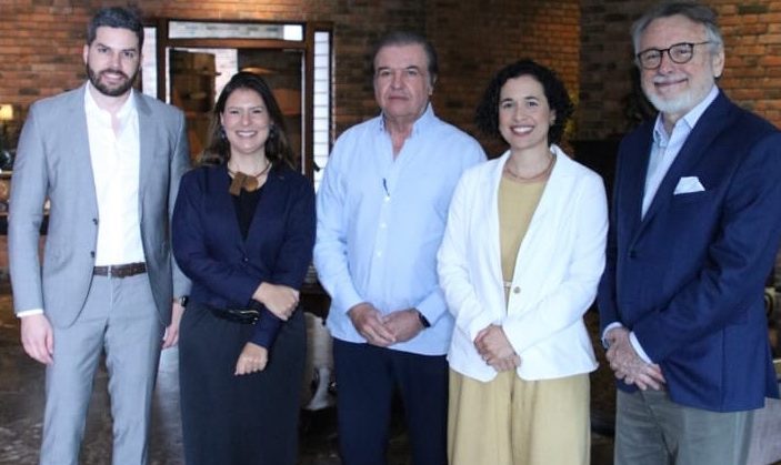 Os sócios da TGI, Fábio Menezes e Francisco Cunha, ao lado de Ricardo Brennand Filho, Ana Luiza Ferreira, diretora-presidenta da ADEPE, e a secretária executiva de Relações Internacionais de Pernambuco, Rayane Aguiar, durante recente encontro promovido pelo Conselho do Comércio França-Brasil para discutir as relações comerciais entre os dois países, em especial com Pernambuco, realizado no IRB na Várzea.