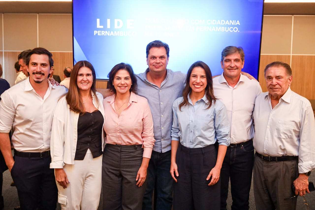 Um registro de Daniel Asfora, Michele Pessoa, Priscila Krause, Drayton Nejaim, Raquel Lyra; Avelar Loureiro e João Lyra Neto durante reunião de trabalho da Gestão Estadual com o LIDE Pernambuco.