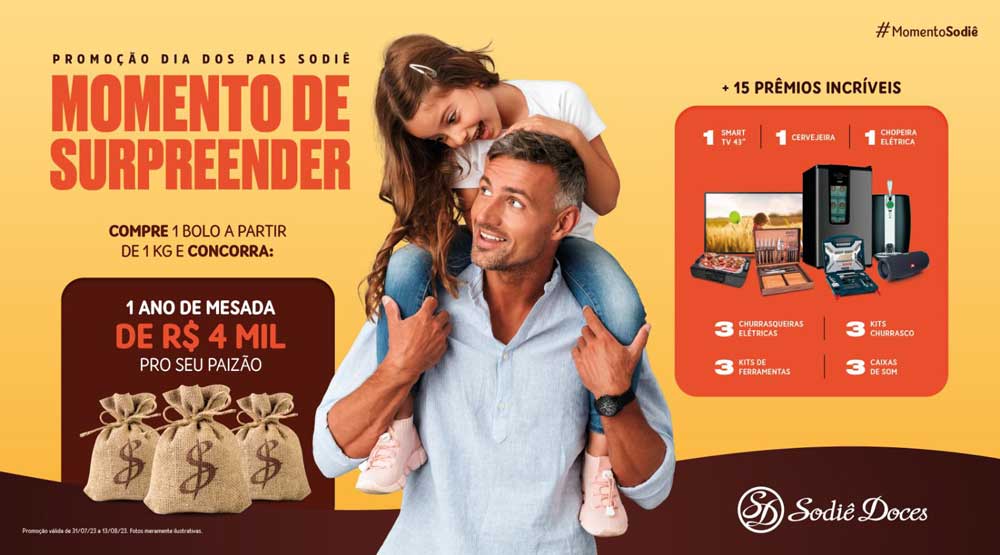 A Sodiê Doces está realizando um sorteio especial em homenagem ao Dia dos Pais com a campanha “Dia dos Pais Sodiê Momento de Surpreender”, que ocorre de 31 de julho a 13 de agosto. A promoção conta com um total de 16 prêmios, incluindo uma mesada anual de 4 mil reais e outros 15 prêmios desejados por qualquer pai.