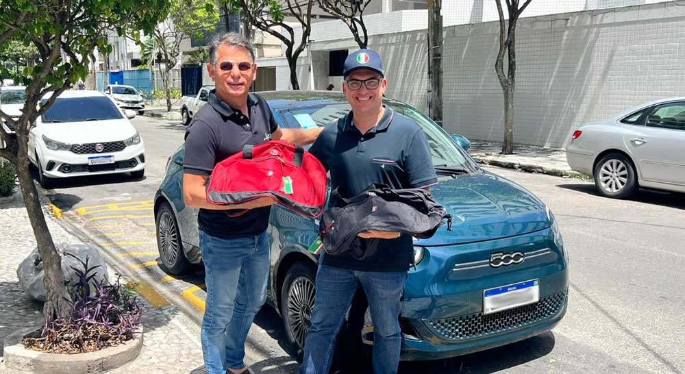 Na manhã desta sexta-feira, o presidente do Clube 500 PE, Cláudio Barreto, recebeu das mãos de Rodrigo Seabra, representante da Fiat Nordeste / Stellantis, as bolsas especiais que serão entregues aos proprietários de Fiat 500 inscritos no passeio. A iniciativa tem o apoio direto da Fiori Fiat, concessionária referência da marca na região, fortalecendo ainda mais a parceria com o grupo pernambucano.