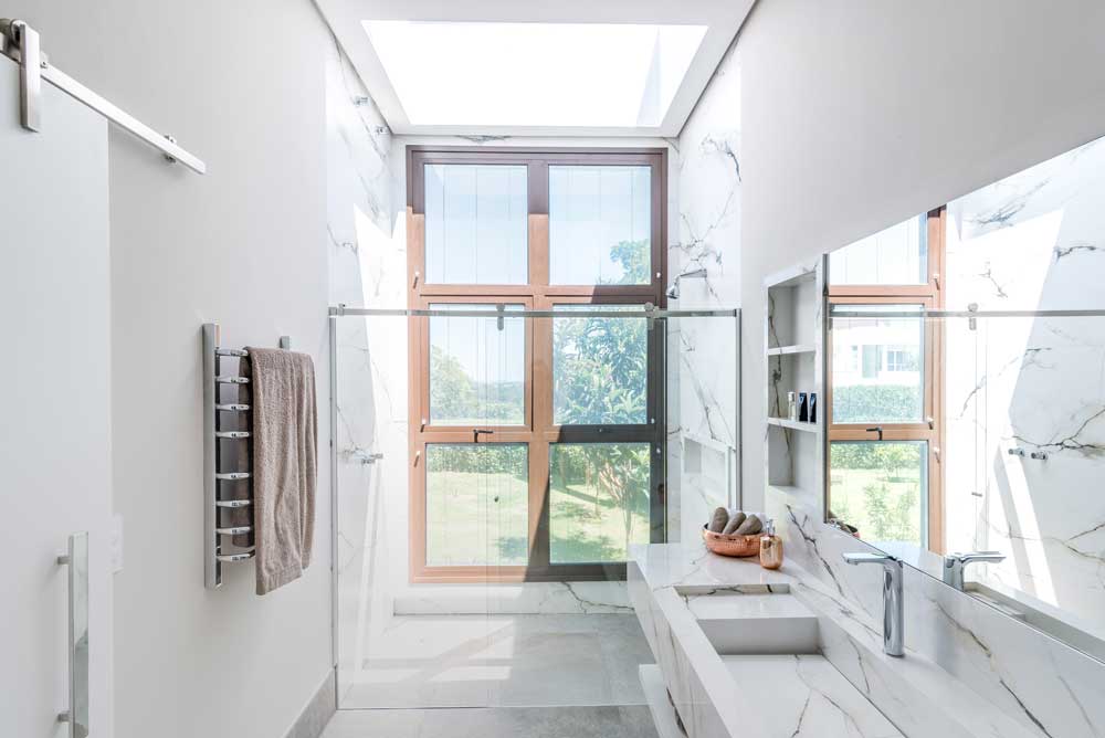 Banheiro com toalheiro elétrico na parte externa do box de vidro em casa projetada pela arquiteta Isabella Nalon | Foto: Julia Herman