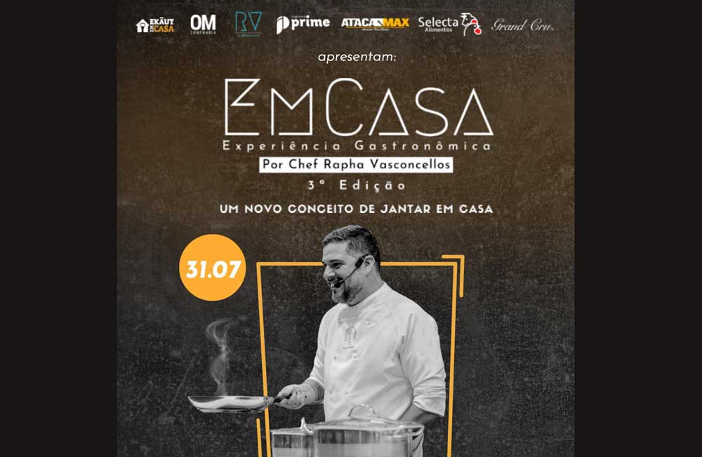 O Chef Rapha Vasconcellos comanda a 3ª Edição do Programa: Um Novo Conceito de Jantar em Casa, com elaboração de  um Menu Harmonizado com a  participação de convidados que irão cozinhar e finalizar os pratos com as orientações do Chef. Uma experiência gastronômica inovadora e um formato único e exclusivo para preparação de duas entradas, prato principal e sobremesa, harmonizando com as cervejas ekäut e o vinho branco Marques de Caceres Verdejo Ruedas.