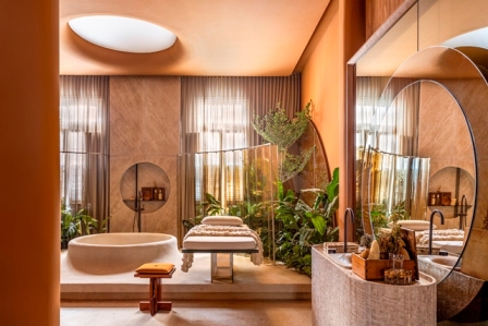 “O ambiente Vertentes VIVIX foi pensado como um refúgio dentro da cidade. Um convite a pausar, respirar e se reconectar. Nele, tons terrosos, jardins internos, pedras naturais, vidros, espelhos, madeira e arte se combinam em harmonia, enquanto a iluminação indireta e a banheira redonda com revestimento monolítico reforçam a sensação de acolhimento e introspecção. Nada é por acaso: cada detalhe guia o olhar e instiga a contemplação”, detalha a arquiteta.